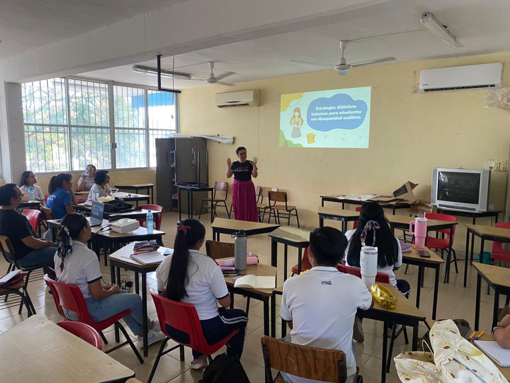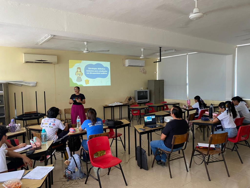 Ayer lunes 31 de marzo de 2025 se llevó a cabo el Taller “Estrategias didácticas inclusivas para estudiantes con discapacidad auditiva” impartida por la Lic. Maritere Echeverria Argüelles a los alumnos del 6to semestre de la LEA de nuestra Institución Educativa.
